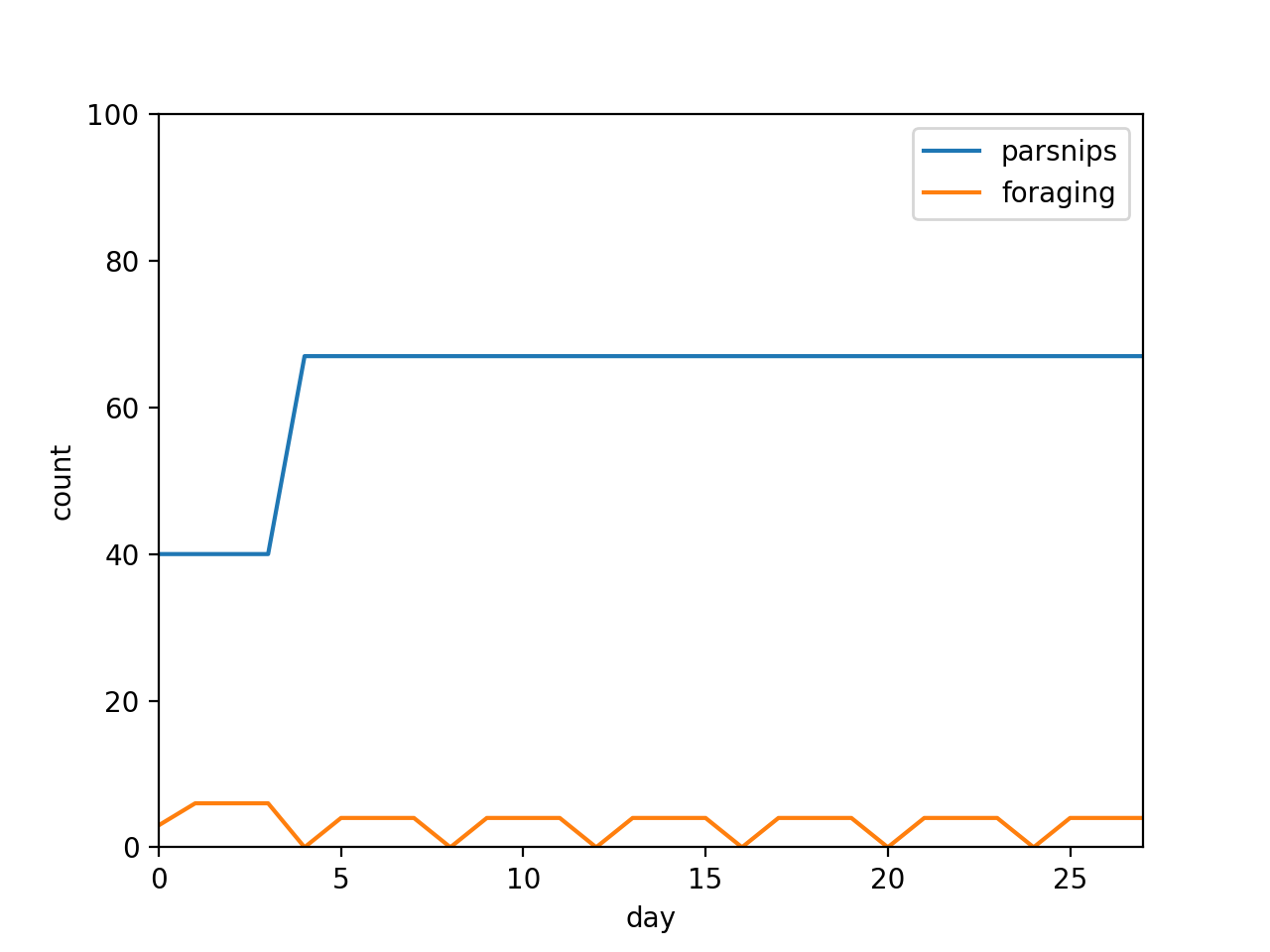 As you can see, at first, crop planting is capital-limited. However, after one planting cycle, it becomes energy-limited at 67 parsnips, which requires just under 270 energy. In order to compensate for the planting energy, every harvest day foraging drops to 0.